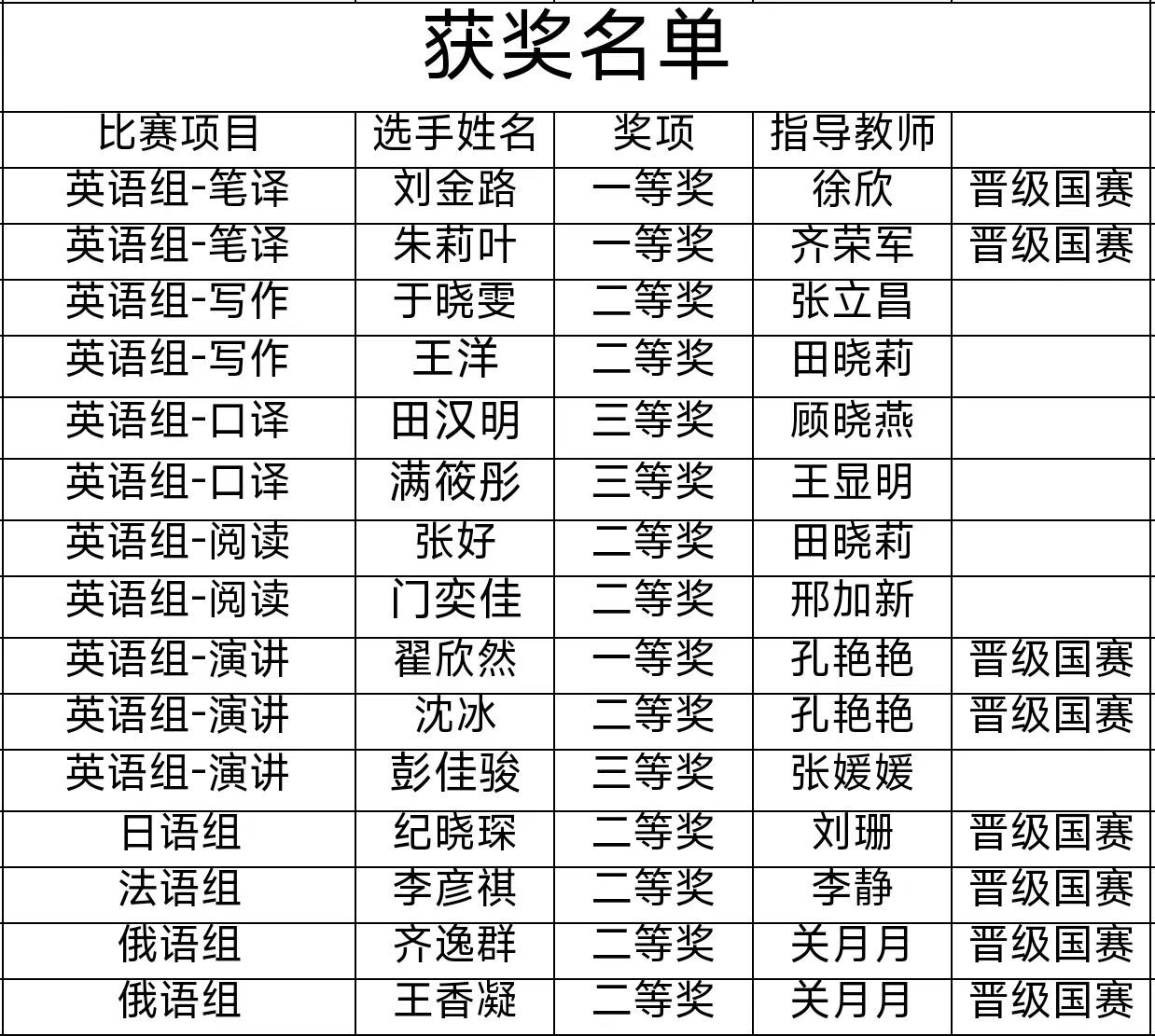 近日,2023年“外研社·国才杯”“理解当代中国”全国大学生外语能力大赛山东赛区比赛圆满结束。本届大赛英语组设置演讲、写作、阅读、笔译和口译赛项,多语种组比赛由大赛组委会统一线上组织。此次大赛中我校学子沉着应战,斩获佳绩!