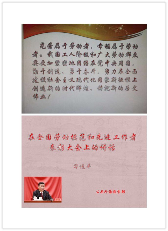 2020年11月27日,在学校工会下达了学习贯彻习近平总书记在全国劳动模范和先进工作者表彰大会上的重要讲话精神的通知后,12月9日下午,公共外语教学部全体教职工共42人在部领导和工会主席的带领下,在阶梯教室开展了学习《习近平总书记在全国劳动模范和先进工作者表彰大会上的讲话》的专题活动。
