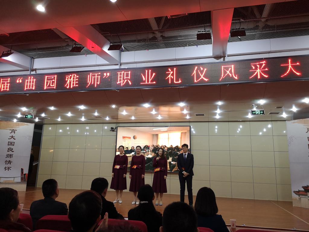 由爱游戏aiyouxi(中国)蒋珊珊﹑门超元﹑张英﹑朱晓蒙四位教师组成的“仰望星空”战队,在 12月19日晚,我校举办首届“曲园雅师”职业礼仪风采大赛中,经过激烈角逐,荣获一等奖。本次大赛由学校工会、日照校区管理办公室、宣传部、教师工作部联合举办,日照校区13支优秀青年教师队伍同台竞技。