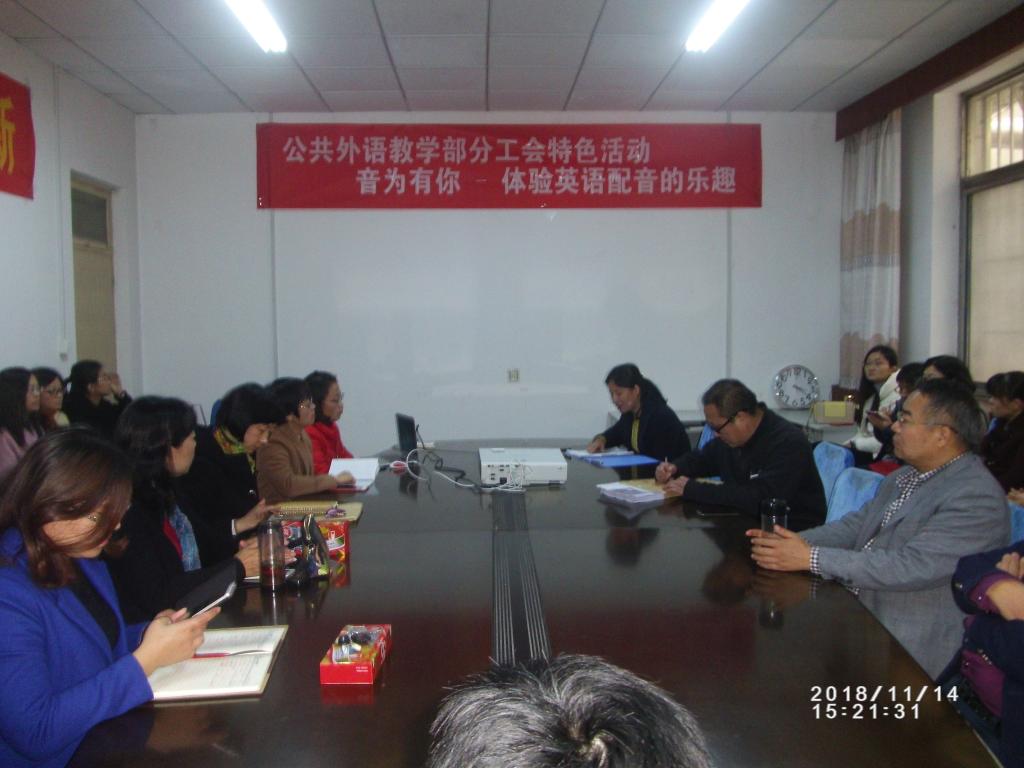 2018年11月14日,在校工会和部领导的支持下,公共外语教学部工会特色活动 — 音为有你(体验英语配音的乐趣)顺利举办。本次活动旨在丰富老师们的课余生活,并借此机会熟练掌握配音软件的使用方法,也可以应用到日常教学工作中。