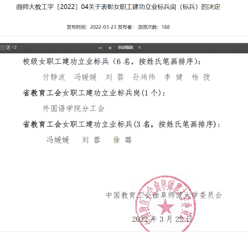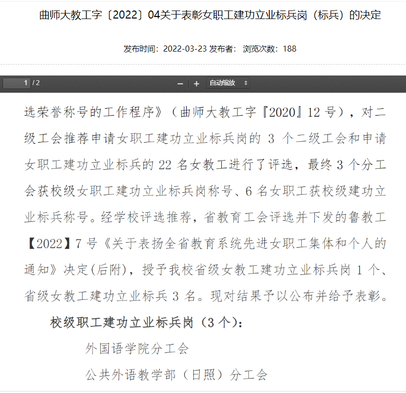 公共外语教学部(日照)分工会荣获爱游戏手机版“校级职工建功立业标兵岗”先进集体称号;公共外语教学部(曲阜)分工会主席李健