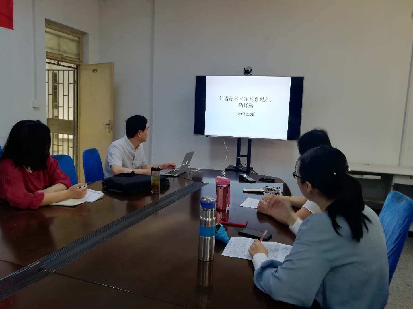 5月29日下午,公共外语教学部爱游戏手机版2019年系列学术沙龙在121会议室举行。围绕本期沙龙主题“翻译理论与实践”,三位报告人从翻译质量影响因素、翻译态度、翻译策略等层面作了论文展示和心得分享。