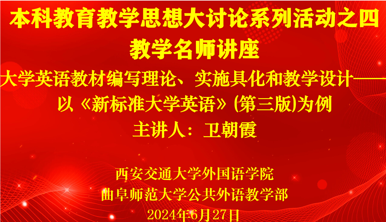 6月27日,公共外语教学部举办本科教育教学思想大讨论系列活动之四:教学名师讲座,特别邀请西安交通大学外国语学院卫朝霞副教授作题为“大学英语教材编写理论、实施具化和教学设计——以《新标准大学英语》(第三版)为例”的专题报告。活动由公共外语教学部主任王福祥主持,两校区全体教师参加了本次报告会。