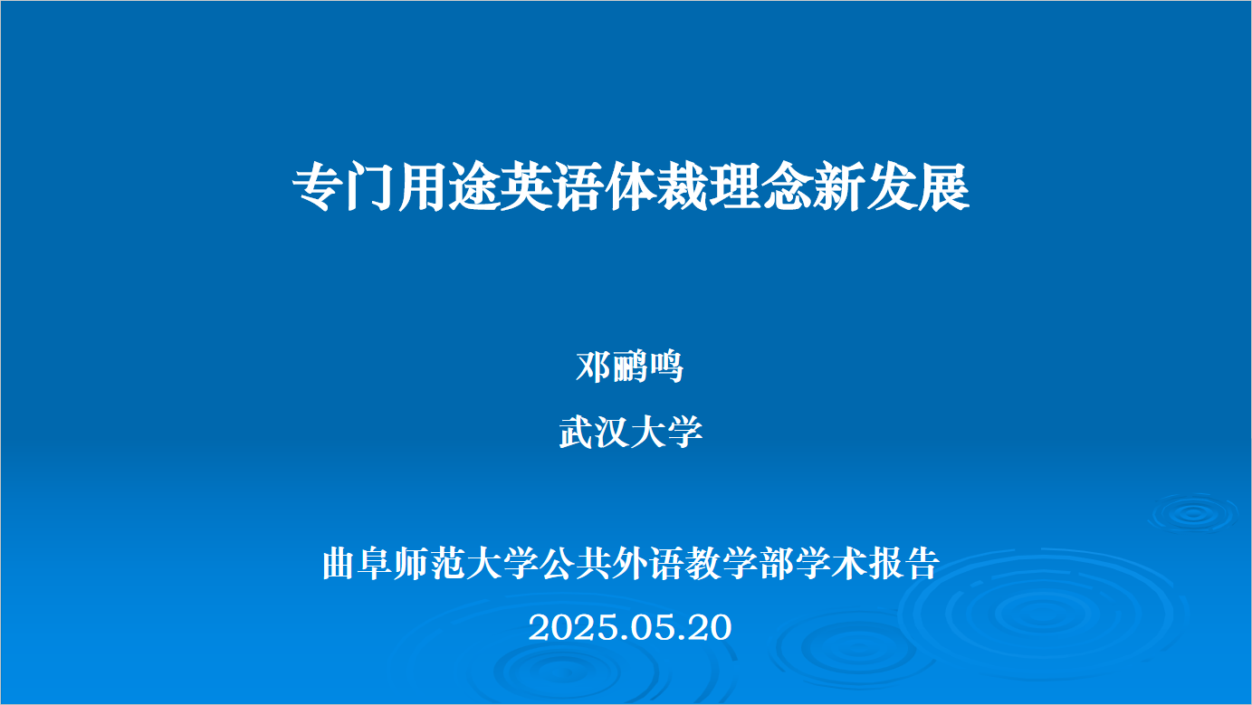 2025年5月20日下午,爱游戏手机版公共外语教学部举办70周年校庆系列学术活动暨博雅讲坛第八场。武汉大学邓鹂鸣教授应邀作题为“专门用途英语体裁理念新发展”的学术报告,公共外语教学部全体教师参加活动。