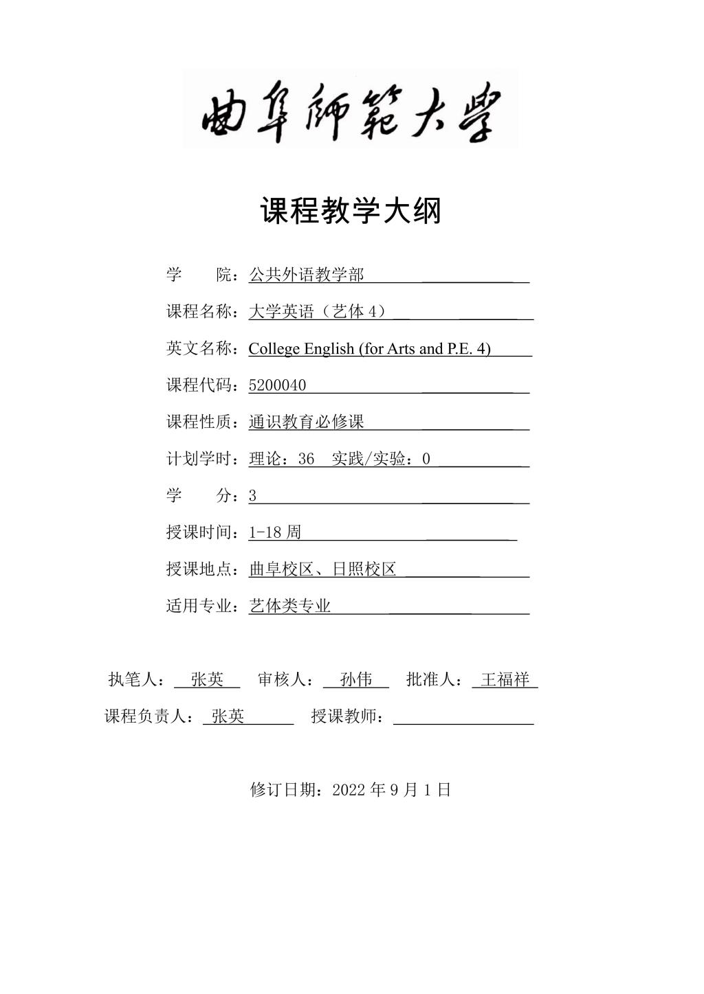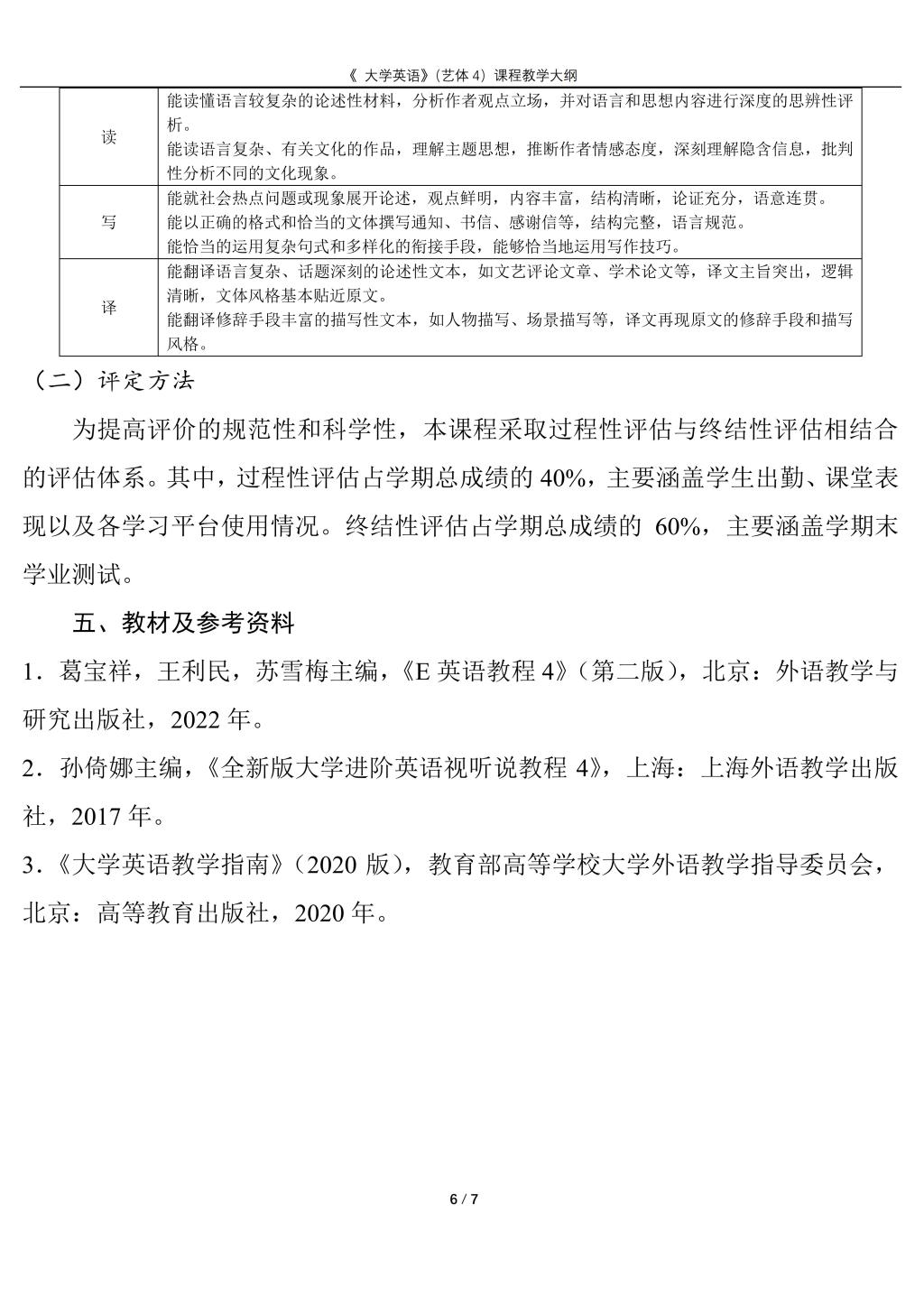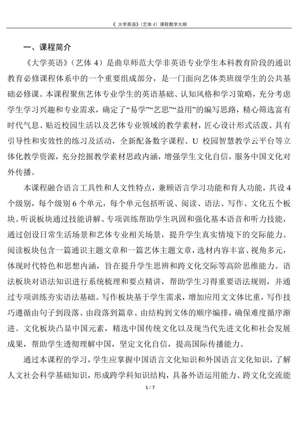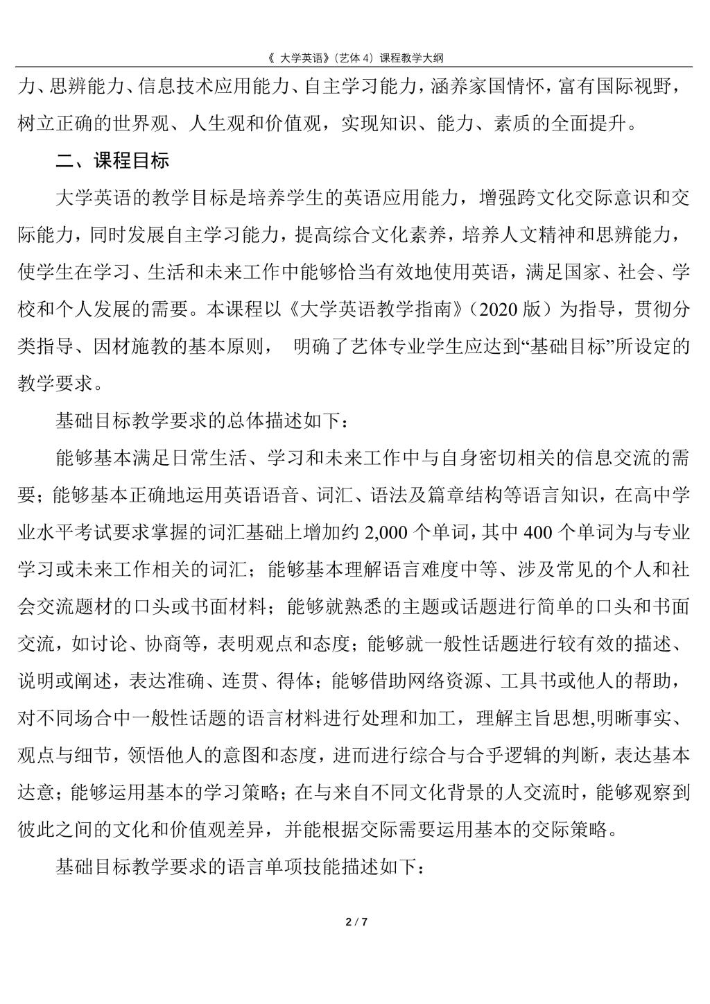 大学英语4(艺体)课程教学大纲(2022版)