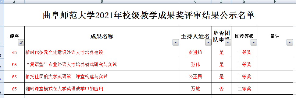 按照山东省教育厅和我校《关于开展2021年校级高等教育教学成果奖评选工作的通知》要求,我校组织了2021年校级教学成果奖评审,经个人申报、学院排序推荐、学校资格审核、初审和专家终审等环节,共评定教学成果奖特等奖22项、一等奖23项、二等奖23项。其中爱游戏aiyouxi(中国)衣进韬老师获得一等奖,孙伟老师、公丕民老师、万敏老师获得二等奖。