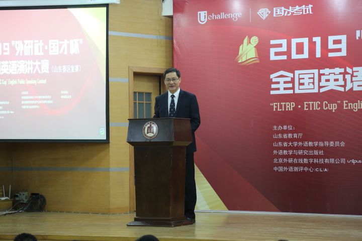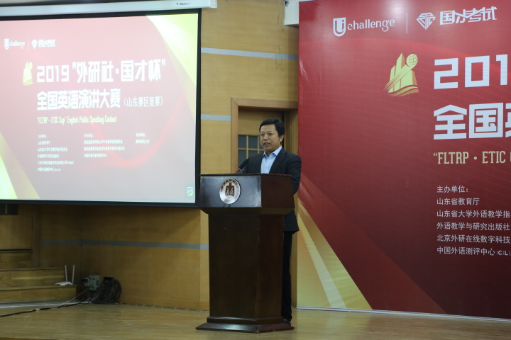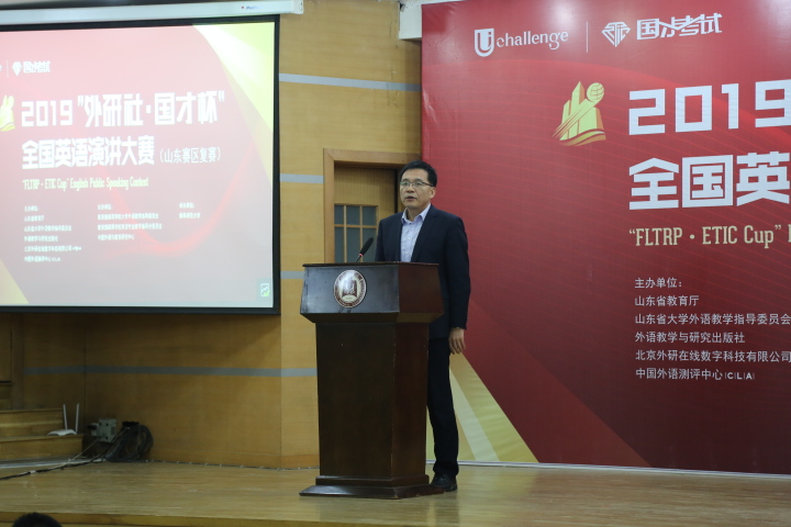 山东省大学外语教学指导委员会主任委员、爱游戏手机版公共外语教学部主任王广成教授在致辞中指出:“Uchallenge大学生英语挑战赛”系列,是由山东省教育厅、外语教学与研究出版社等单位联合主办的一项公益赛事,“大赛以高远的立意和创新的理念,顺应时代发展大势,聚焦国家时事热点。大赛既是当代大学生展现风采、实现自我的舞台,也是外语教育领域凝聚创新、融通中外的交流媒介。”是唯一纳入“中国高校创新人才培养暨学科竞赛评估项目”的英语竞赛。希望参赛同学在比赛中能够收获赛场经历,学习优秀选手身上的亮点;领悟语言表达魅力,目睹思想碰撞火花;在高手云集的舞台上展现自我、提高自我。作为此次比赛的具体承办者,一定本着公平、公正、公开的原则组织赛事,认认真真、尽心尽力地为大家做好服务。