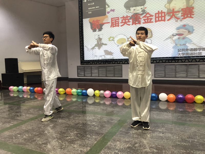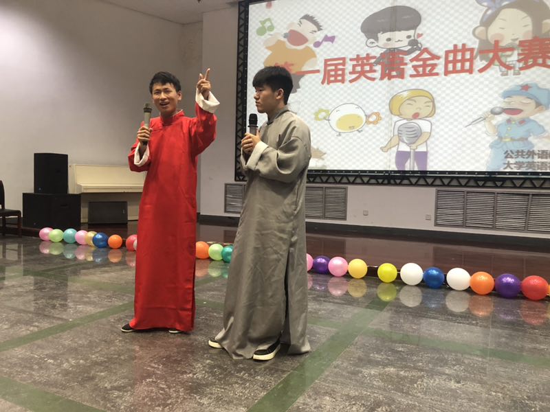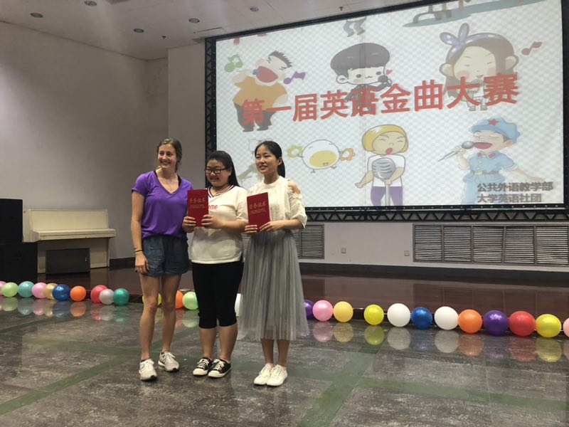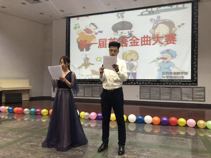 为提高同学们学习英语的趣味性,丰富校园英语学习生活,5月25日下午六点三十分,在公共外语教学部老师指导下,由大学社团举办的第一届外语金曲大赛决赛在大学生活动中心401举行。比赛邀请了正在我校进行访问交流的美国路易斯安那州立大学副校长埃蒙·哈尔平先生、国际交流处负责人妮娜·考克斯女士、交流生代表茉莉·帕克斯担任评委;李苗和柴源梓同学担任主持人。