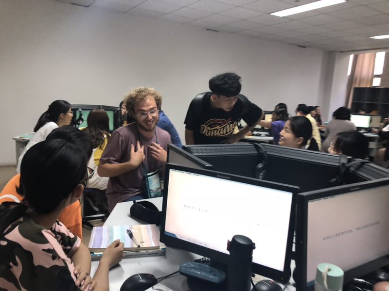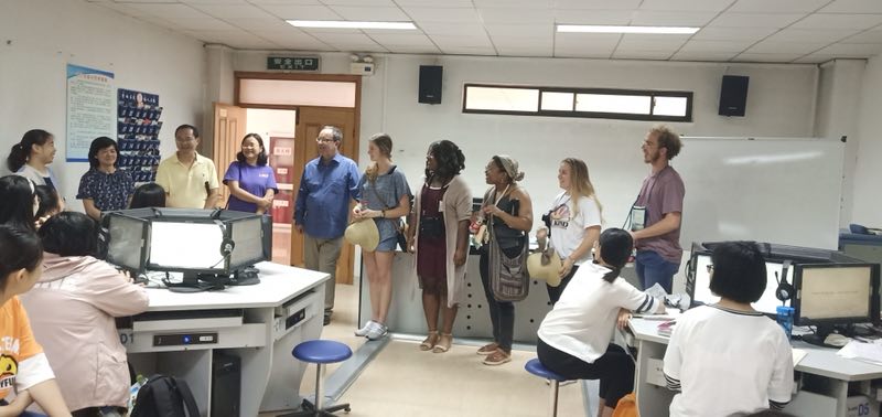 虽然天气炎热,师生们仍将到校后第一站选在爱游戏aiyouxi(中国)位于实验中心的A311语音室进行课堂观摩,希望和学生们进行互动交流。爱游戏aiyouxi(中国)三级起点周四班同学和仲蕾老师对他们的到来表示了热烈的欢迎。代表团成员做了简单的自我介绍,随后坐到同学们身边。仲蕾老师向来访师生介绍了爱游戏aiyouxi(中国)爱游戏手机版多媒体语音室的使用情况,大学英语教学的课程设置和开展现状。随后,来访师生加入班级学习小组,由我校同学带领参观校园,开始了一堂户外英语听说课。