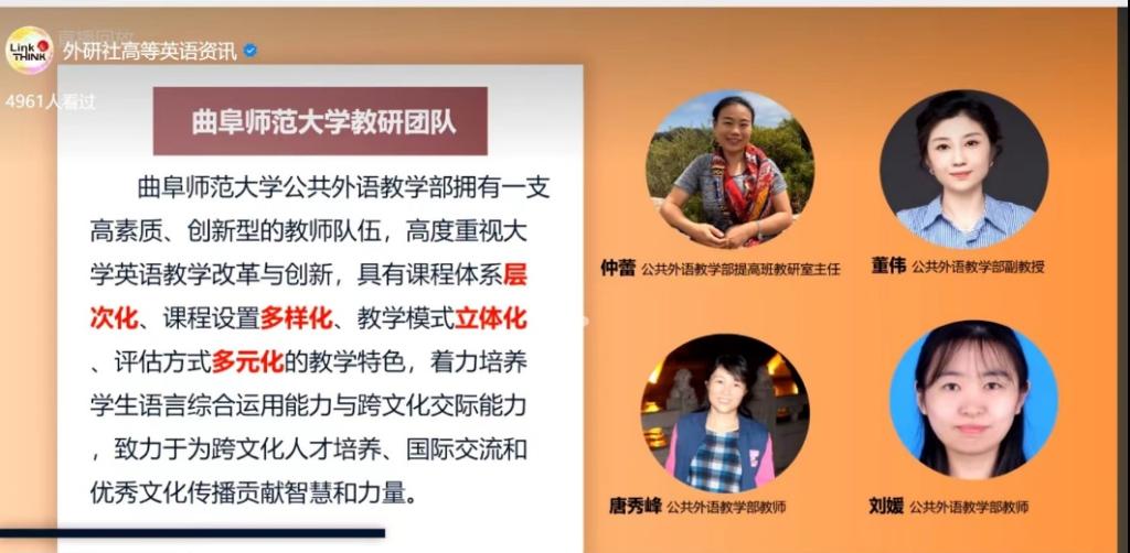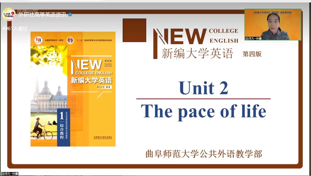 《新编大学英语》(第四版)虚拟教研室由浙江大学牵头,汇聚全国8所不同类型的院校,每一期由一所院校的教研团队基于教情、学情和课程建设情况,与广大教师分享《新编大学英语》(第四版)一个单元的课程设计思路,探讨教学方法。仲蕾老师、董伟老师、唐秀峰老师和刘媛老师组成我校教研团队,负责《新编大学英语》(第四版)第一册第二单元The pace of life的课程分享。
