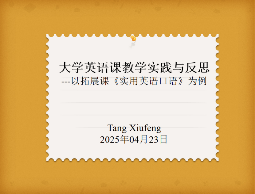 2025423日,公共外语教学部组织全员研训活动,聚焦大学英语教学实践与反思主题。活动中,唐秀峰老师以拓展课《实用英语口语》为例,分享了自己的教学经验与教学反思,为在场教师带来了新思路和新启发。研训中,唐老师从教学准备、课堂管理、技术应用、学生互动和评估反馈等多个关键维度展开分享。