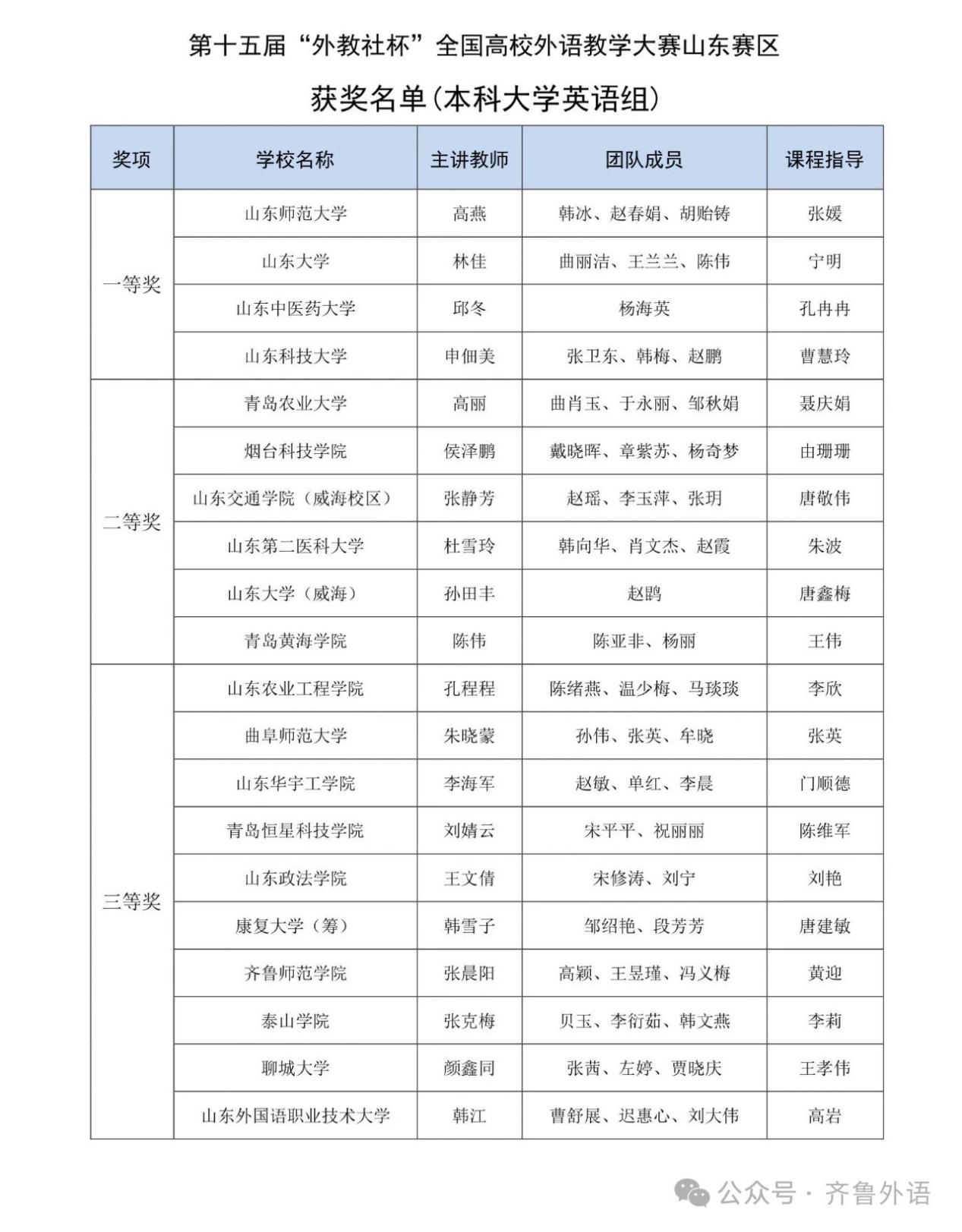 5月10日至12日,第十五届“外教社杯”全国高校外语教学大赛山东赛区复赛和决赛在山东师范大学长清湖校区成功举行。爱游戏手机版选派的公共外语教学部朱晓蒙教师团队在比赛中展现了良好的业务素质,荣获本科大学英语组三等奖。