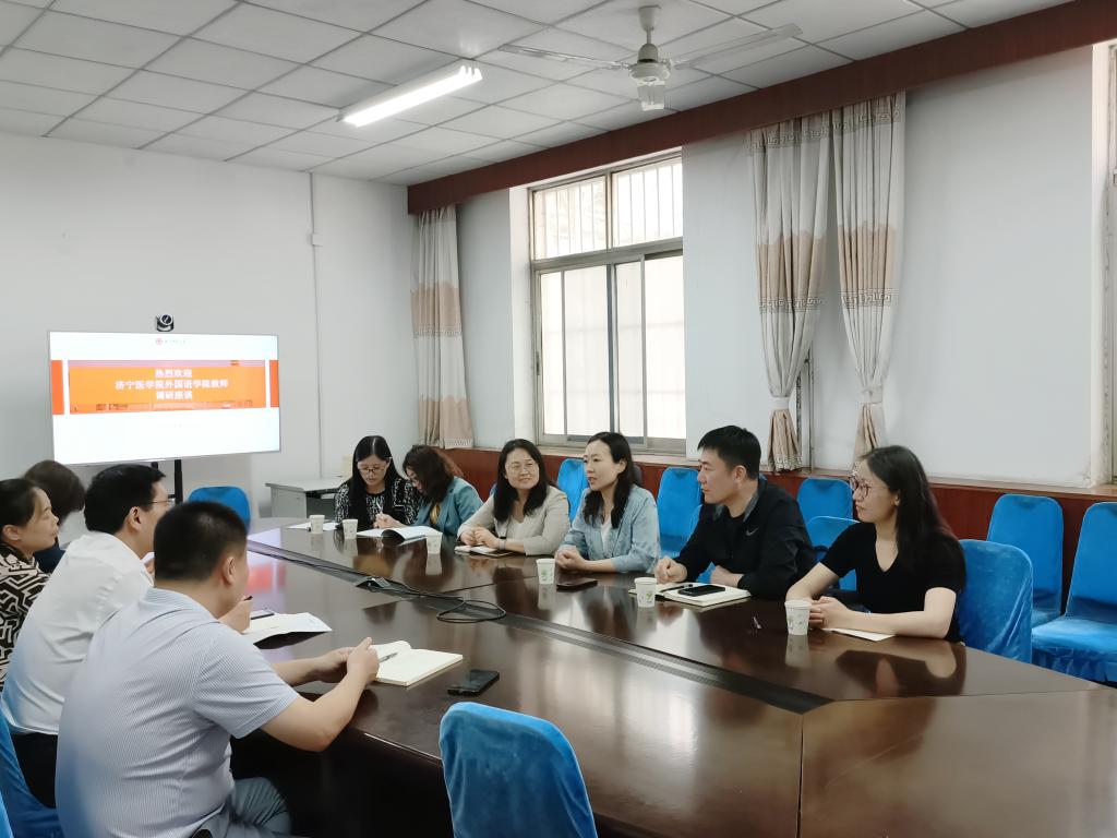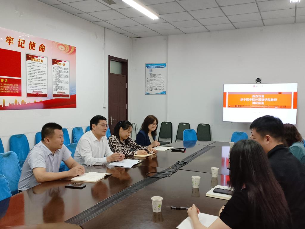 6月1日,济宁医学院外国语学院院长朱敏教授一行来爱游戏aiyouxi(中国)考察交流。陪同考察的有学院副书记史飞、副院长褚宏蕊,以及综合科、教研室相关负责人张洁、崔运君、司梦老师。爱游戏手机版公共外语教学部主任王福祥、副主任王显明亲切接待了来访客人。教研室主任杜明真、仲蕾一同参加了交流座谈会。